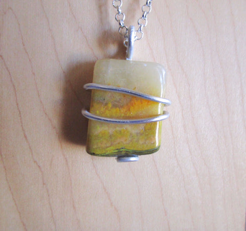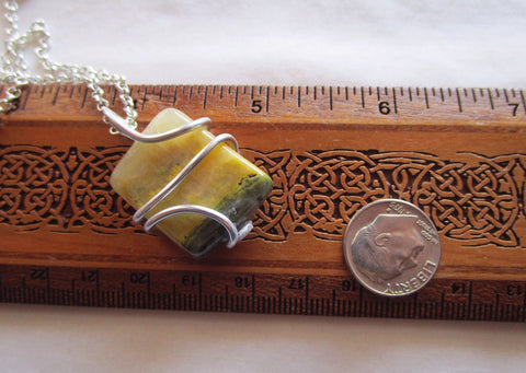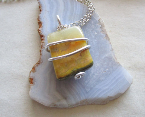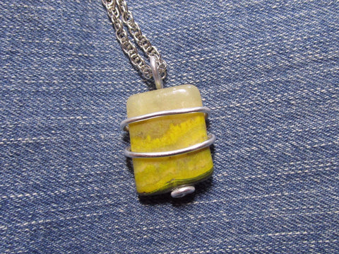 I wrapped a natural polished bumblebee jasper crystal stone with silver aluminum wire. This comes with a 24 inch silver plated chain. The stone has a slight color change with more orange is some light.