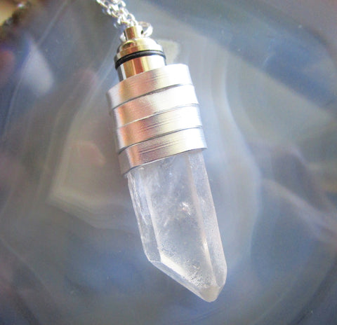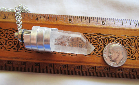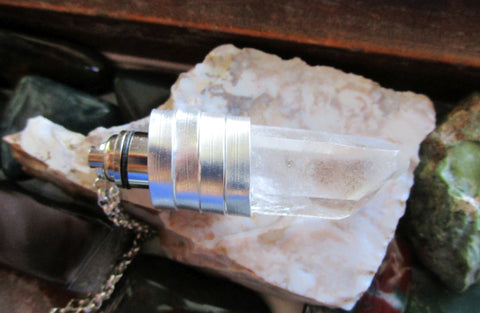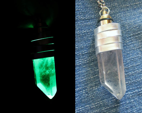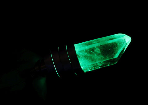 I attached a green LED light to a natural raw quartz crystal point, and wrapped it with silver wire. The quartz has natural inclusions and the ladder like parallel lines that are typically seen on Lemurian crystals. This comes with a 24 inch silver filled chain. Twisting the bail at the top will turn the light on or off. A great necklace to wear for nighttime parties and festivals. You're sure to be noticed wearing this striking pendant. Other colors and types available. Contact me for details.