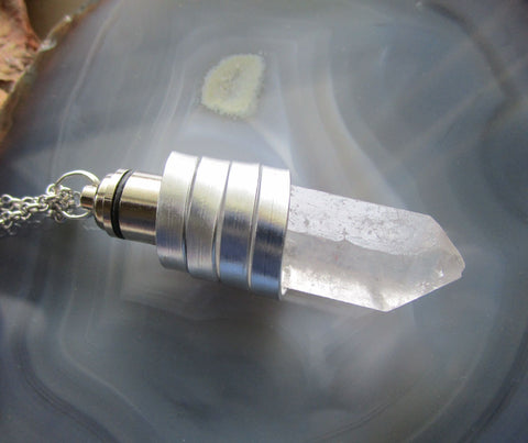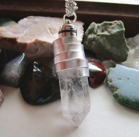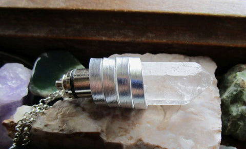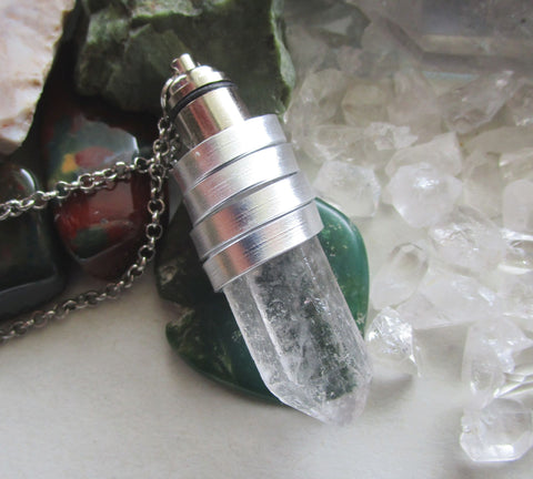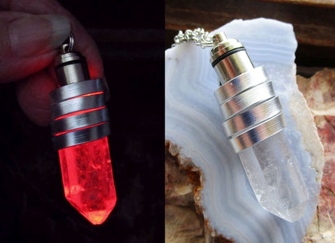 I attached a red LED light to a natural quartz crystal point, and wrapped it with silver aluminum wire. This comes with a 24 inch silver plated chain. The quartz has natural inclusions. Twisting the bail at the top will turn the light on or off. The LED light is powered by cell batteries. It can be worn with the light turned off as well. I will include an extra set of batteries with your purchase.