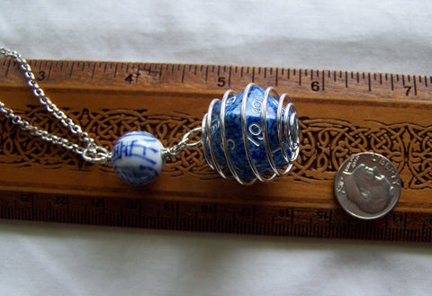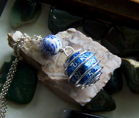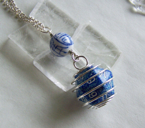 I combined a silver spiral caged vintage D20 RPG die with a blue speckled pattern and a blue and white ceramic bead with the Chinese Shou character on it. This comes with a 24 inch silver filled chain. The D20 can be removed from the cage and used in games.