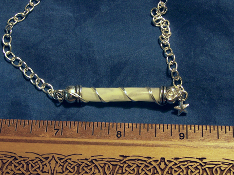 I used a flexible clear vial and added quartz crystals and glow-in-the-dark pale green paint. I wrapped the vial with silver wire, attached pewter onion dome caps and added a dangling tiny silver star charm. This comes with a silver plated link chain and is approximately 17 inches long. Celestial Atmospheric space dust contained in a miniature vial to wear. A great Steampunk or Cosplay accessory.