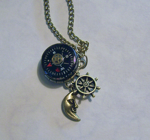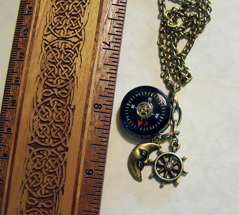 I attached a small brass watch gear to a compass and then placed it in a brass setting with a bamboo pattern. I added a brass ship's wheel and a man in the moon charm. This comes with a 24 inch brass chain. A great little nautical piece to guide you through your Steampunk journey.